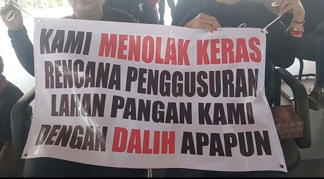 Menolak keras rencana penggusuran lahan pangan kami dengan dalih apapun ” kata Andi Rustono ditirukan puluhan anggota Paguyuban Kulon Terminal Induk Pemalang .