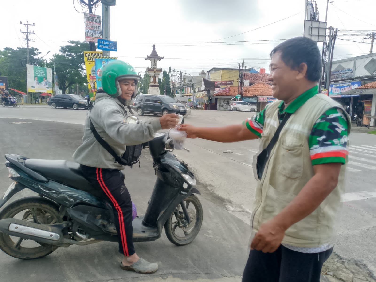 Dibantu putranya Rama Dwi Hutomo bang Ramsus membagikan sekitar 70 an bungkus Bubur Kacang Hijau yang sudah dikemas dalam cup plastik kepada para pengguna jalan yang melintas di Perempatan Lampu Merah Sirandu Pemalang .