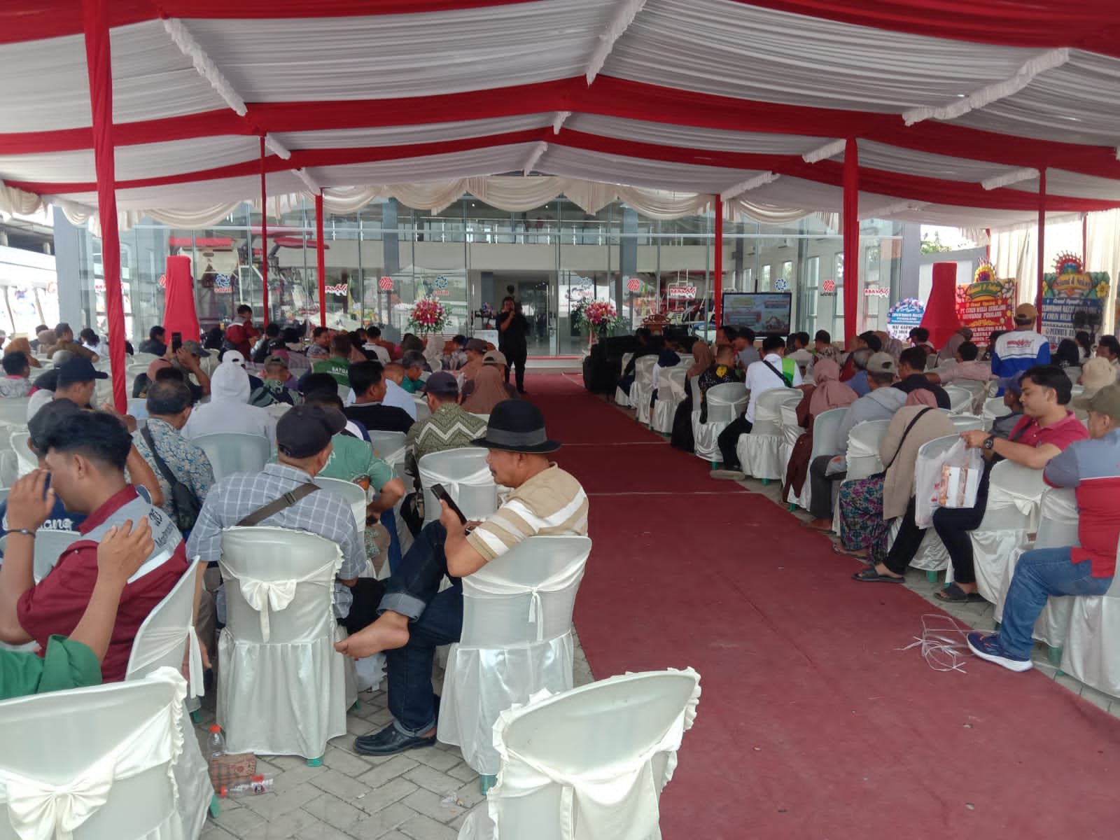Terlihat ratusan petani dari masing – masing Gabungan Kelompok. Tani ( Gapoktan ) yang ada di wilayah Pemerintah Kecamatan Petarukan Kabupaten Pemalang Provinsi Jawa Tengah pada moment Grand Launching Showroom