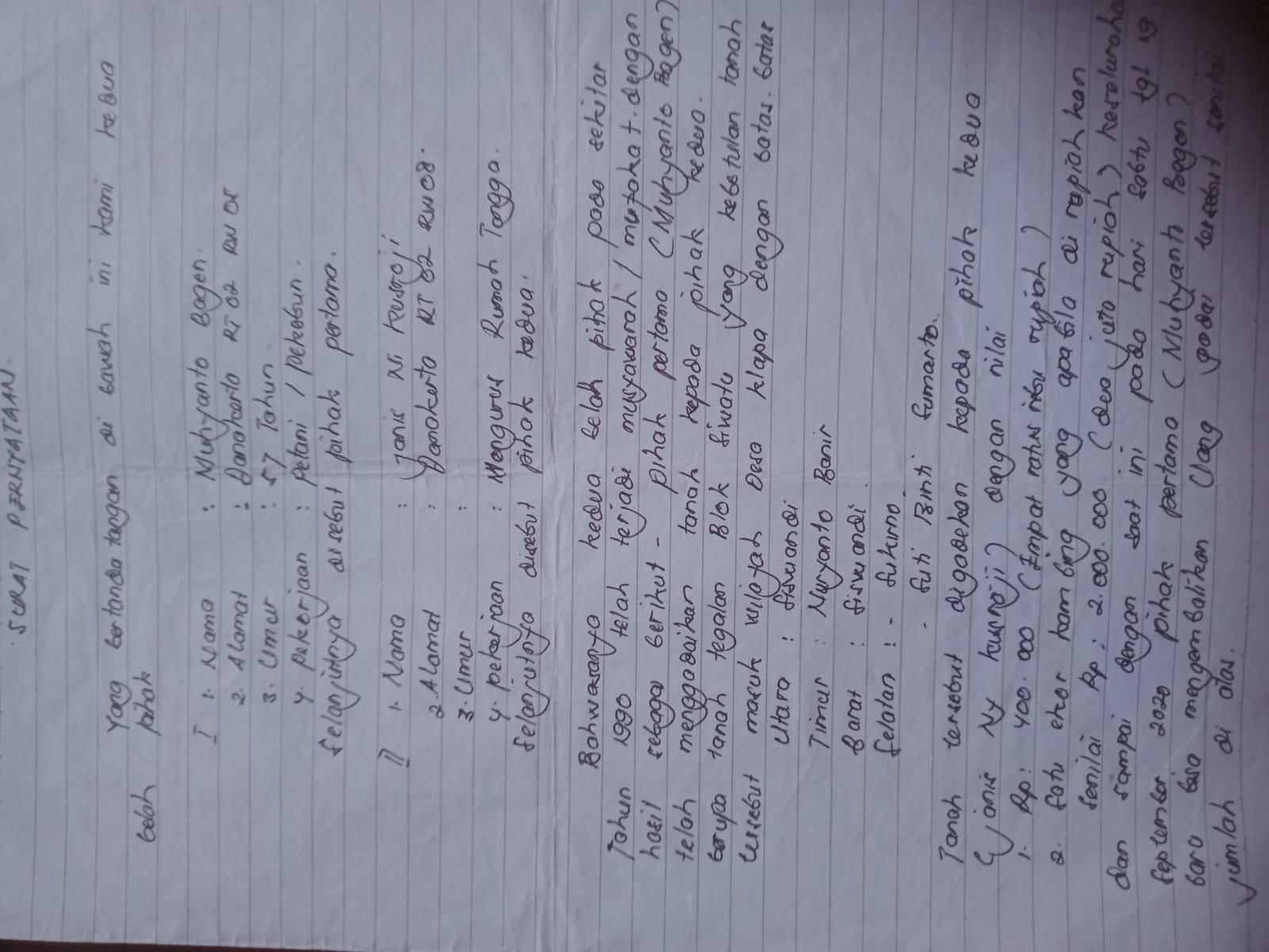 Kesepakatan penebusan tersebut dituangkan dalam surat pernyataan bermaterai dan disaksikan oleh tujuh orang yang terdiri dari unsur perangkat desa serta keluarga pihak Janis. Namun setelah kewajiban dipenuhi, Muhyanto justru mengetahui bahwa tanah miliknya telah dibalik nama dan tercatat atas nama pihak lain. Proses tersebut diduga dilakukan tanpa persetujuan dan tanpa sepengetahuan dirinya sebagai pemilik sah.