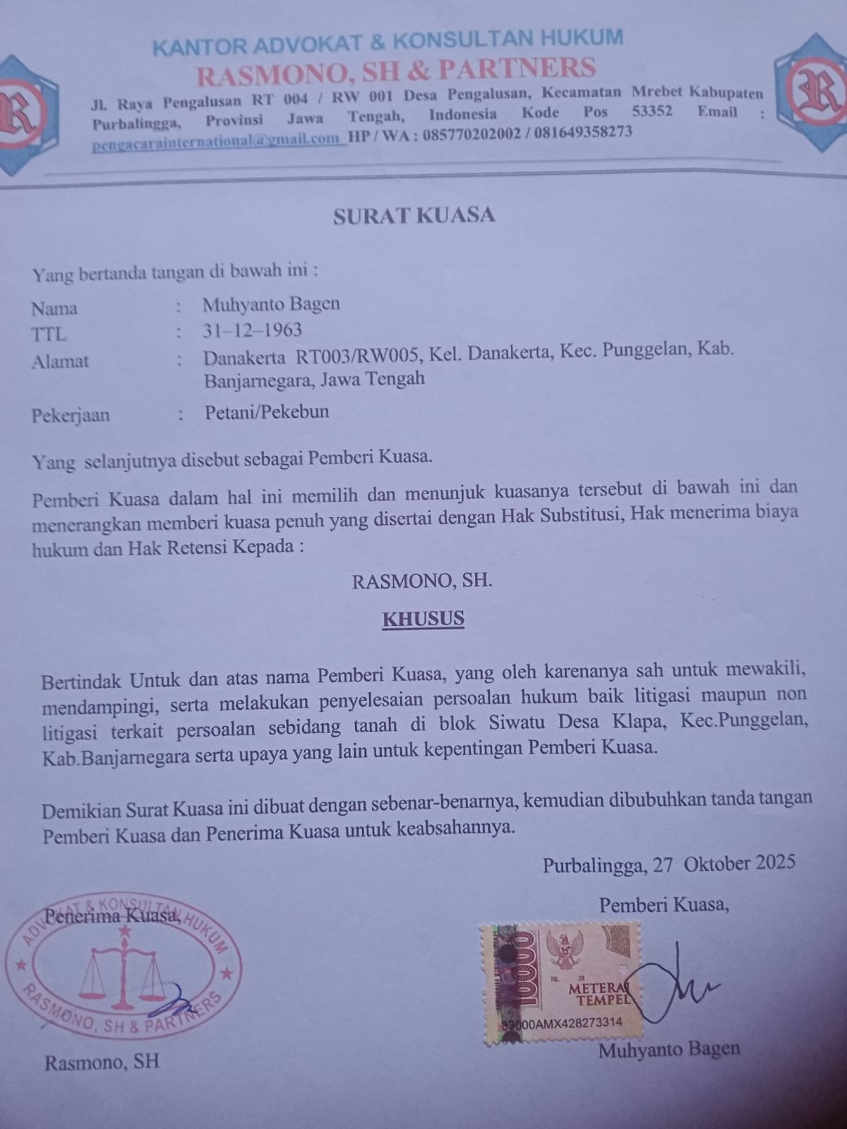 Kuasa hukum Muhyanto Bagen, Rasmono, S.H., menyatakan bahwa pihaknya telah berupaya menempuh penyelesaian secara administratif dan kekeluargaan sejak menerima kuasa pada 27 Oktober 2025. Namun, tidak adanya respons dari pemerintah desa dinilai sebagai bentuk kelalaian dalam menjalankan fungsi pelayanan publik, khususnya di bidang pertanahan.