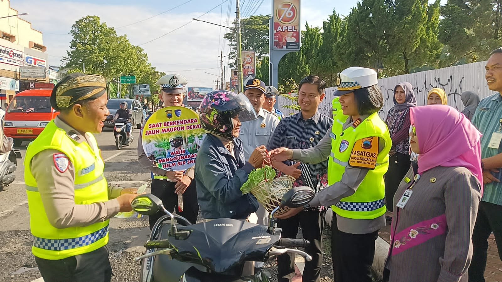 “Helm dan sayuran dibagikan kepada pengguna jalan yang telah tertib berlalu lintas baik dari kelengkapan kendaraan maupun surat-suratnya,” katanya.
