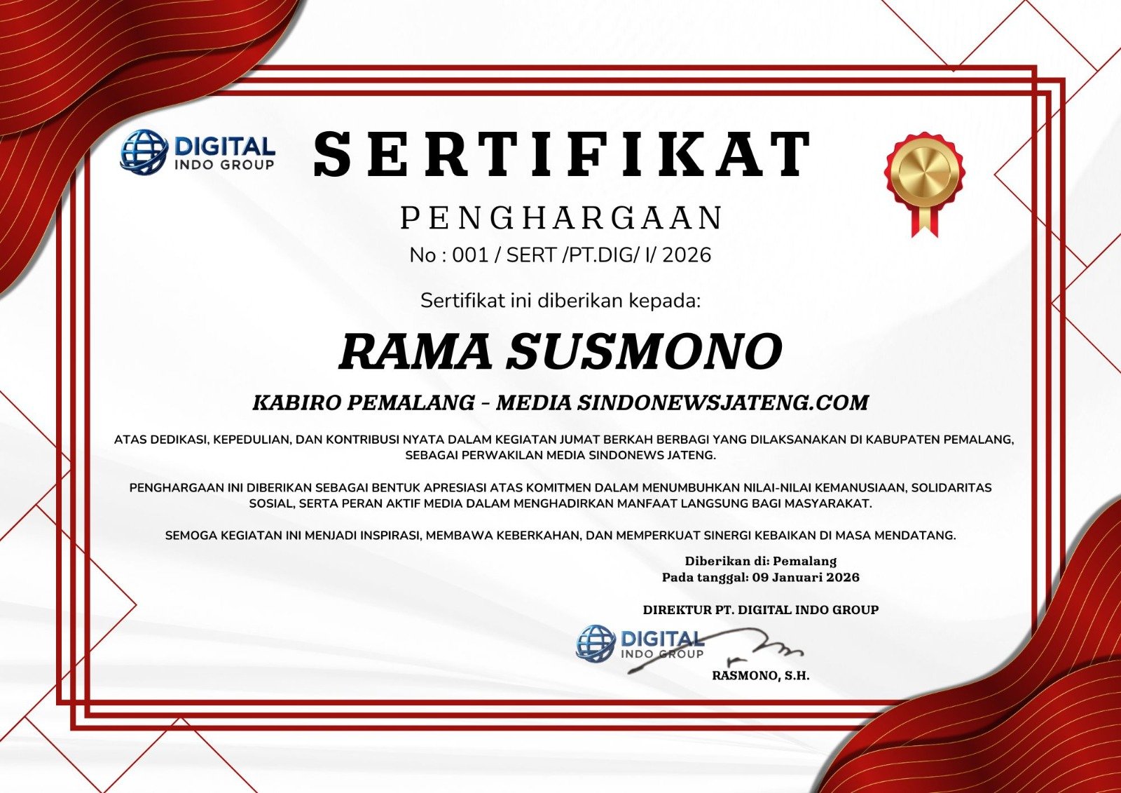 Perasaan senang, syukur demikian yang dirasakan oleh Susmono ( bang Ramsus ) Kabiro Pemalang Sindonewsjatengcom. Media Online yang merupakan salah satu media dari 50 media PT. Digital Indo Group setelah ada pemberitahuan dari Pimpinan Redaksi (Pimred) bahwa dirinya menerima Sertifikat Penghargaan melaksanakan Program Bakti Sosial Jum’at Berkah Bagi-bagi Nasi Bungkus di Pemalang pada tanggal 9 Januari 2026.
