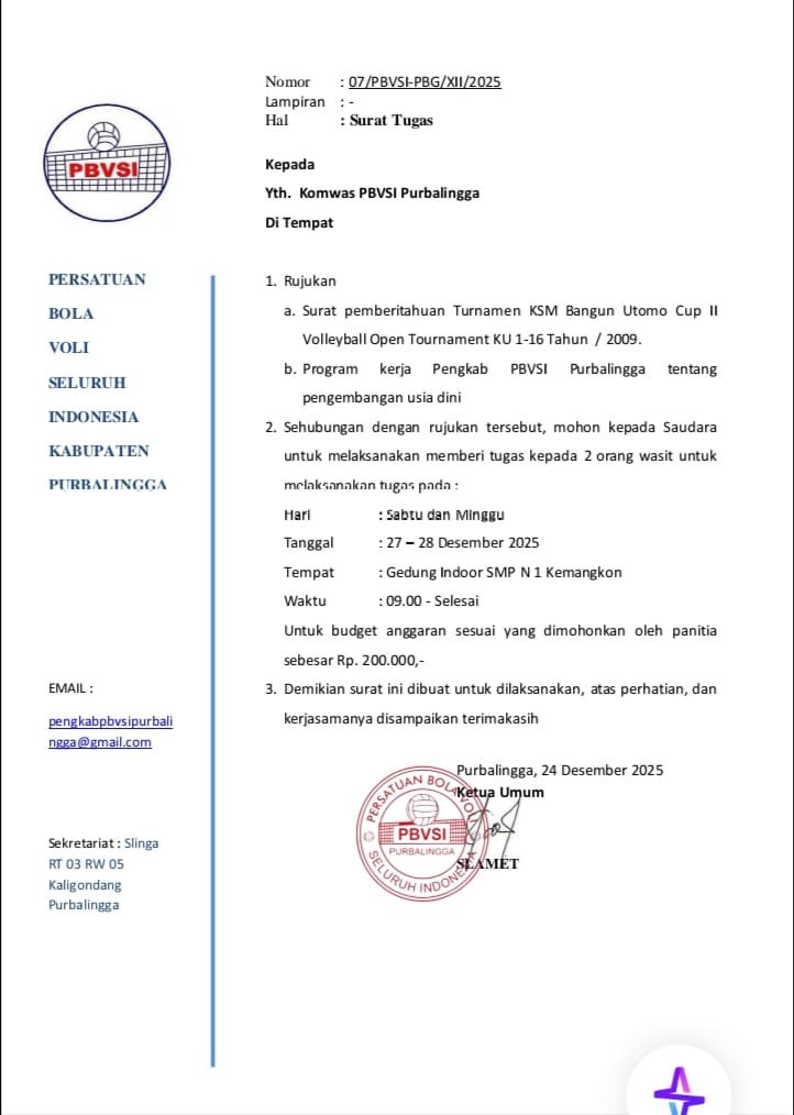 PURBALINGGAsindonewsjateng.com | Turnamen Bola Voli Putra Antar Klub U-16 KSM Bangun Utomo Cup II di Kabupaten Purbalingga menuai sorotan menyusul ketidakhadiran wasit yang telah ditugaskan secara resmi oleh Persatuan Bola Voli Seluruh Indonesia (PBVSI) Purbalingga. Padahal, penugasan tersebut telah dituangkan dalam surat tugas yang ditandatangani Ketua PBVSI setempat.
